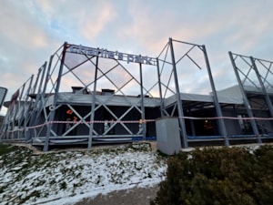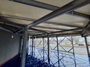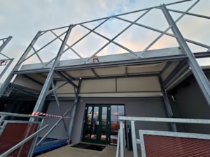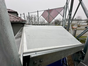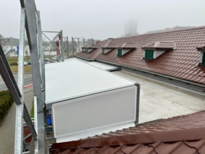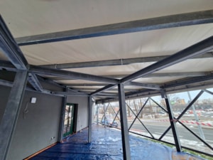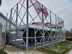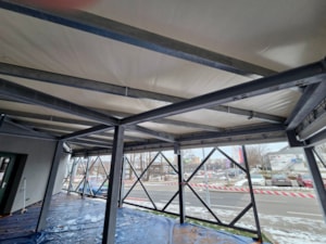Beispiel für eine Segelabdeckung einer sehr untypischen Dachkonstruktion einer Restaurantterrasse in Brünn im Technologiepark der Technischen Universität.
