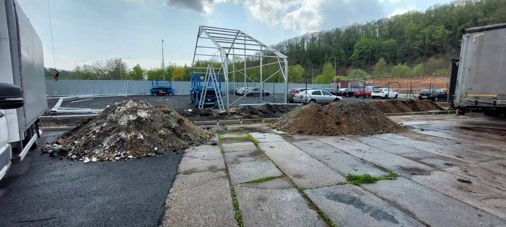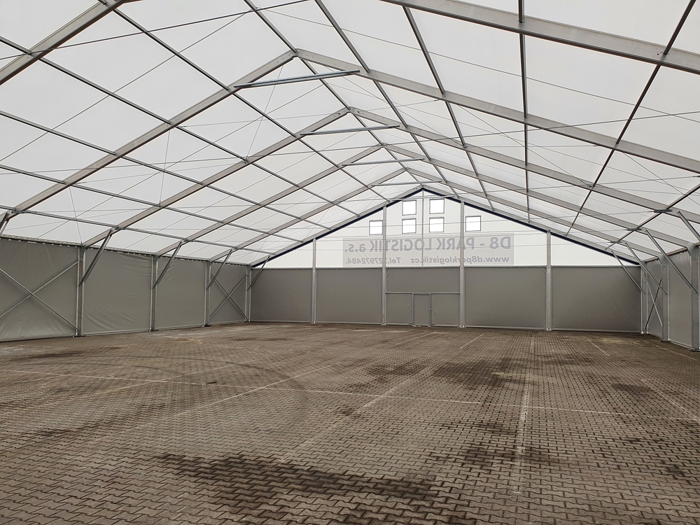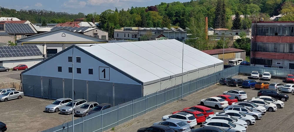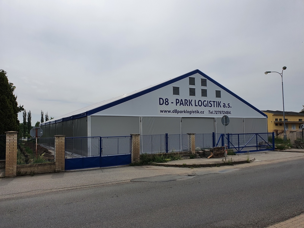 Für die Unternehmen Logistik D8 und Josefův Dvůr haben wir zwei identische Zeltkonstruktionen hergestellt. Grundfläche 25 x 35 m, Seitenwandhöhe 4 m, mittiges Fronttor und Notausgänge. Errichtet auf bestehenden Flächen mit Verbundpflaster und verdichtetem Boden.