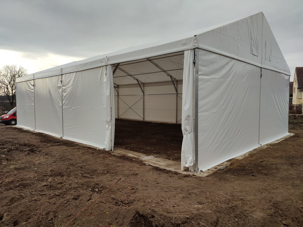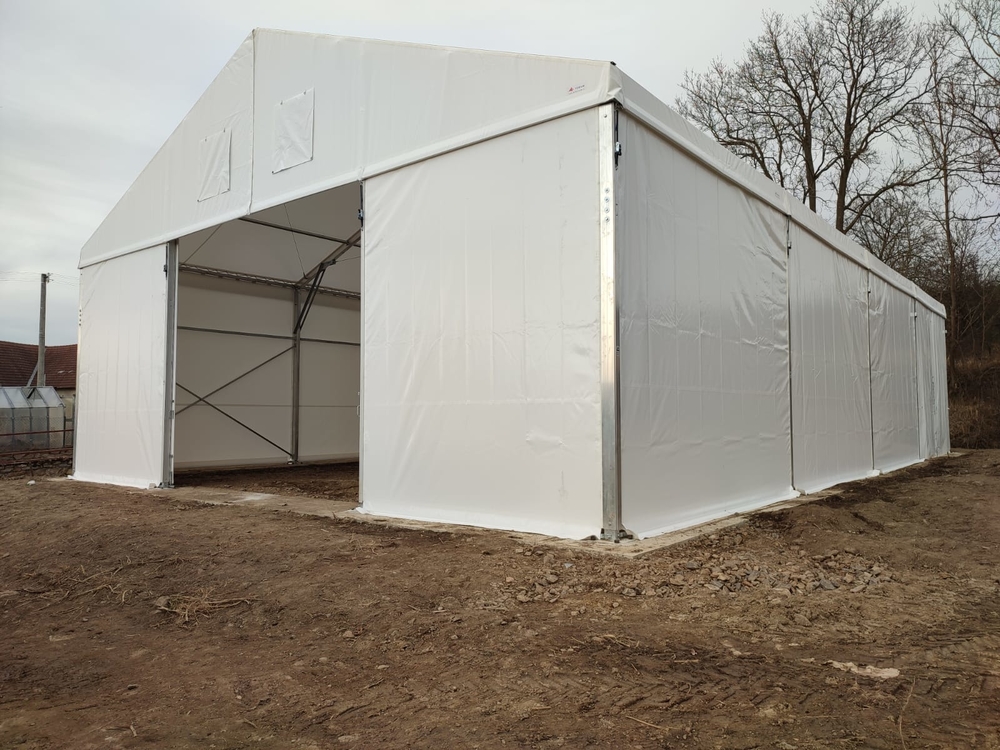 Wenn Sie sichergehen möchten, dass Ihre Zeltkonstruktion auf unebenem Gelände richtig verankert ist, können Sie sich von diesem Referenzprojekt inspirieren lassen. Der Kunde entschied sich für eine kostengünstige und effektive Lösung mit Betonplatten, die um den Umfang der tragenden Fundamente der Konstruktion herum verlegt wurden. Dadurch werden die Ebenheit des Fundaments und die Stabilität der Verankerungsnägel gewährleistet. Zelthalle 12 x 20 m mit einer Seitenwandhöhe von 4,5 m, mittig versetztes Fronttor. Realisiert für die Firma Plevka in Koječín.