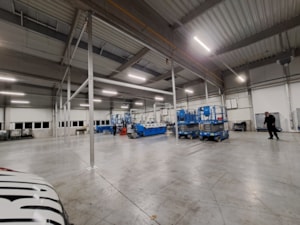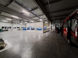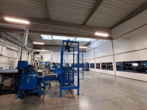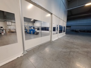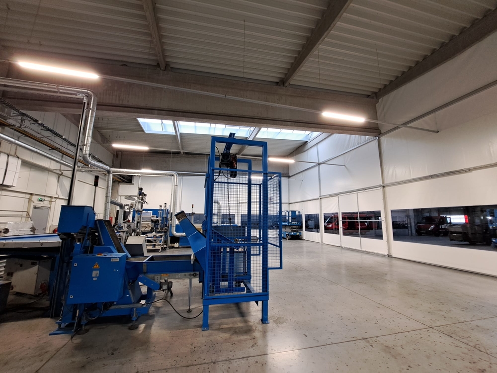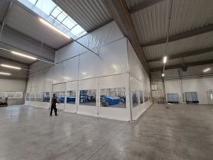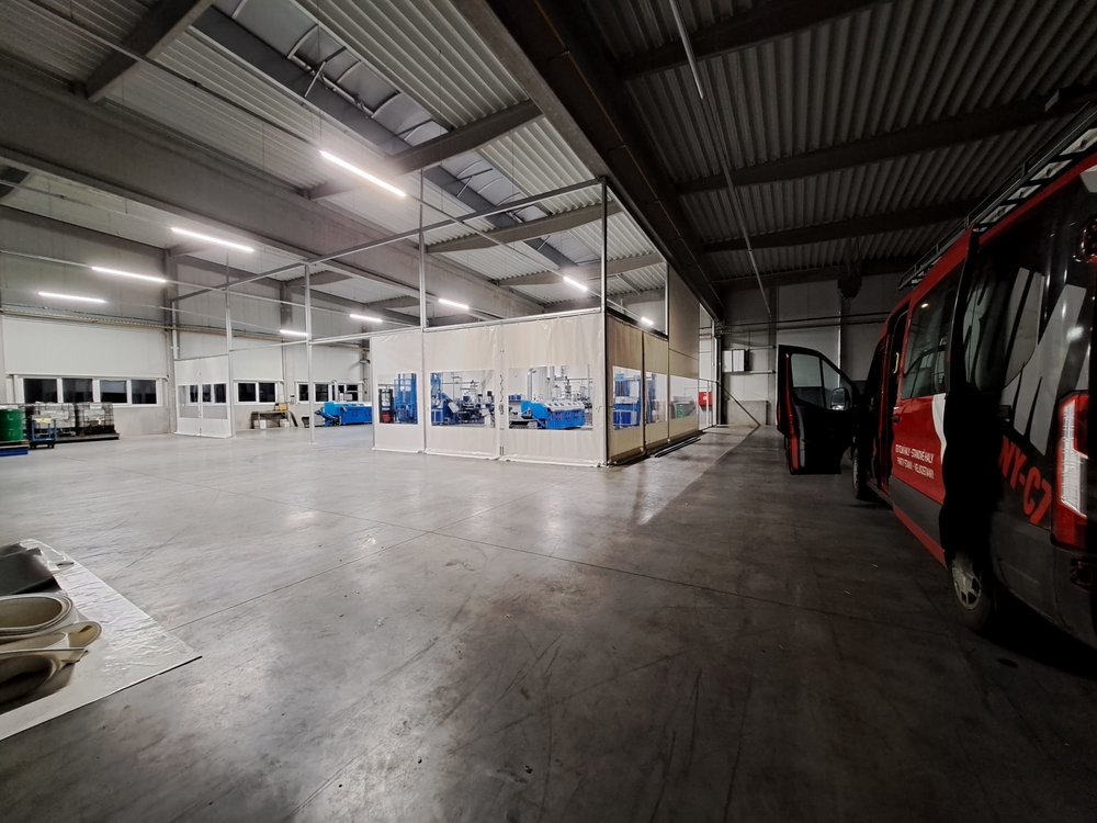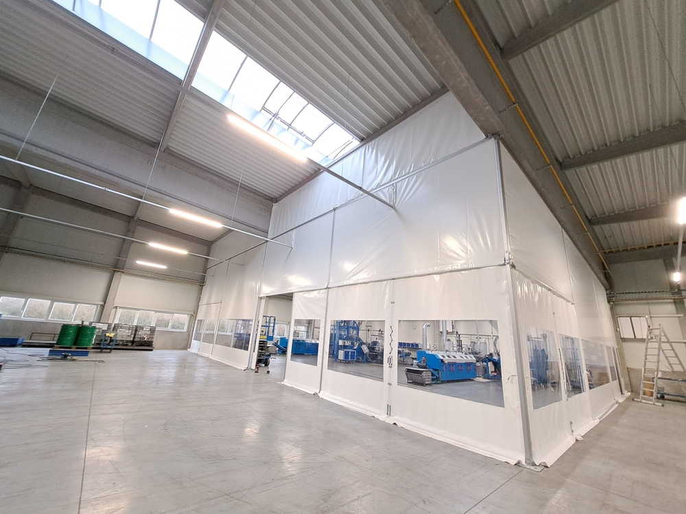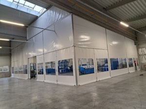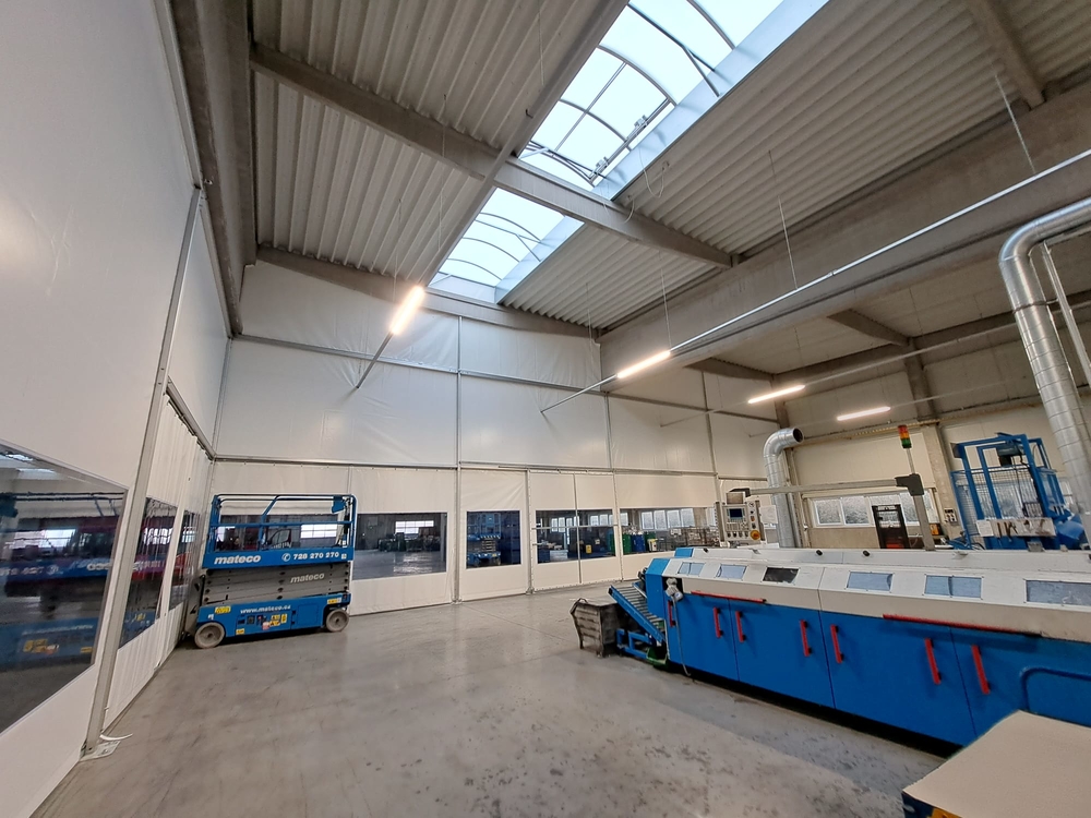 Innenliegende industrielle Planenwand für eine Produktionshalle, Sonderanfertigung für die Firma Leist aus Jičín. Trennung der Presslinien von den Lagerräumen. Grund: Beheizung eines kleinen Produktionsbereichs innerhalb einer großen Halle, Vermeidung von Staub aus den umliegenden Lagerräumen. Abmessungen ca. 7,6 x 35 m, Grundriss in L-Form. Rahmenkonstruktion aus Al/Fe-Modulen. Nicht brennbare Planen in einzelnen Modulen der Konstruktion. Durchgänge sind mit Schiebetoren und aufrollbaren Planeingängen ausgestattet. Die Trennwand ist mit Folienfenstern ausgestattet. Modulares System mit der Möglichkeit der sofortigen Demontage.
