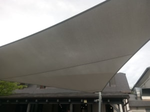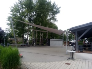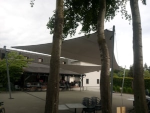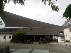 Neues Design unter Verwendung des hochwertigen Segeltuchmaterials Soltis Perform 92 Boulder. Dieses Material des weltweit führenden Herstellers Serge Ferrari aus Lyon in Frankreich hat mehrere Vorteile. Hervorragender Sonnenschutz, optimaler Sichtkomfort durch Leichtigkeit, Luftigkeit und Farbvielfalt, Stoffbeständigkeit, UV-Beständigkeit, lange Lebensdauer und innere Stabilität durch die Precontraint-Technologie. Damit eignet sich dieses Material sehr gut für die Beschattung von Ruhezonen. Beispiel aus der Pension Nový Rybník in Obořiště. Abschirmung des Außenbereichs eines Restaurants.