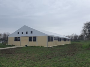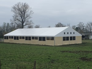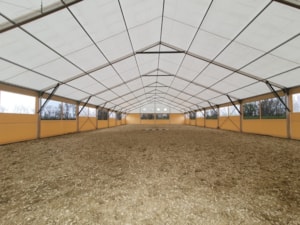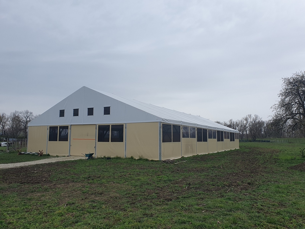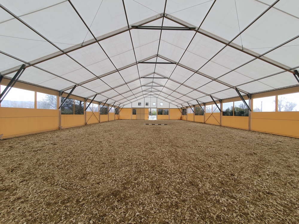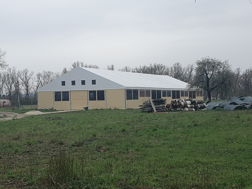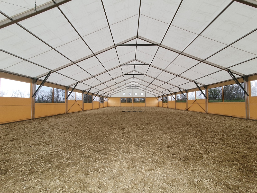 Hier ein Beispiel für eine weitere Reithalle für Pferde. Diesmal in Piešťany in der Slowakei auf einem Familienbauernhof. Abmessungen 20 x 40 m mit einer Seitenwandhöhe von 4 m. Ausgestattet mit Fronttoren und Netz- und Folienfenstern. Die Netze sorgen das ganze Jahr über für ausreichende Belüftung und Luftzirkulation im Innenbereich der Halle. Die Folienfenster sorgen wiederum für ausreichend Lichteinfall und schaffen eine angenehme Atmosphäre und optimale natürliche Bedingungen für Menschen und Tiere. Einfache Montage, variable Länge, unkomplizierter Transport. Mit unseren Planenhallen können Sie sogar (im übertragenen Sinne) reisen :)!
