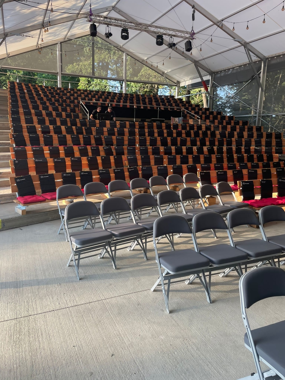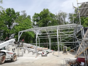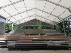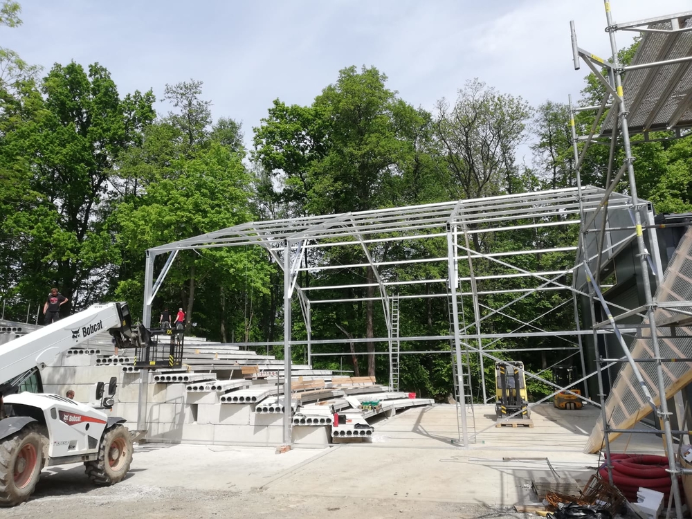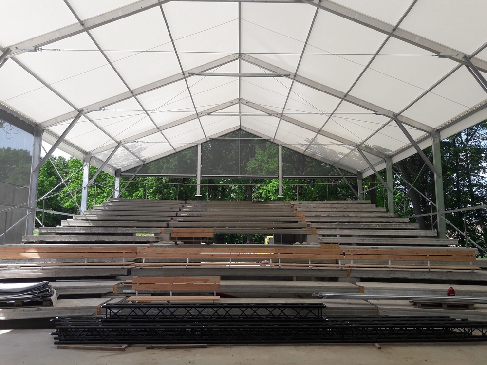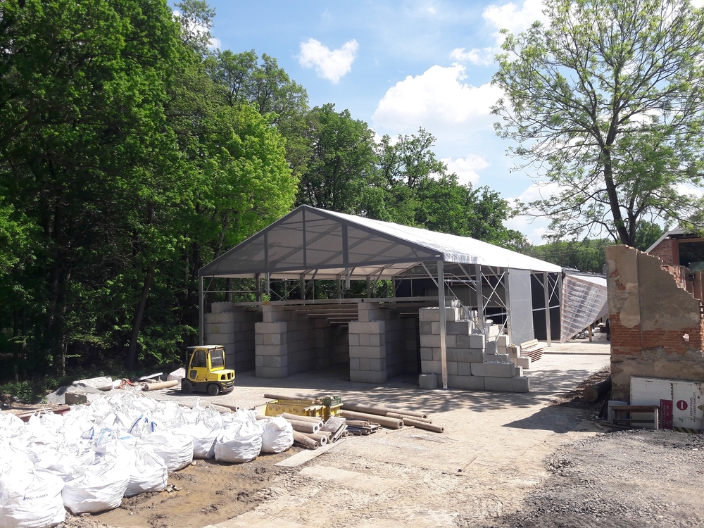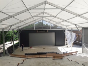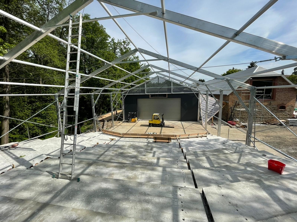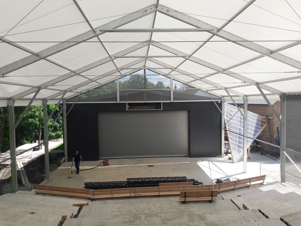Für die netten Leute von der AVT Group haben wir eine zerlegbare Zeltüberdachung für den Zuschauerraum des Theaters entworfen und hergestellt. Die Abmessungen betragen 15,2 x 25 m mit einer Seitenwandhöhe von 6 m. Die Dachplane ist lichtdurchlässig, die Giebel und Seitenwände bestehen aus luftdurchlässigem Netzgewebe. Das Industriegebäude fügt sich somit in das Gesamtkonzept der neu errichteten Sommerbühne des Dejvické divadlo ein.