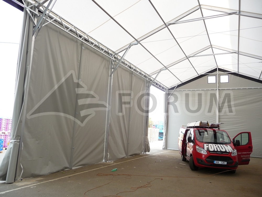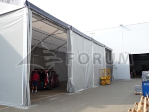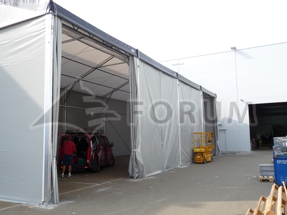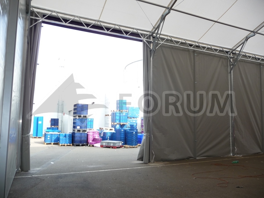 Weitere Sonderanfertigung einer Zelt-Halle für die Firma Fränkische. Atypische Abmessungen, Grundriss 9 x 20 m, Seitenwandhöhe 5,6 m, einzigartige Ausführung der Halleneingänge. Alle seitlichen Module der Konstruktion sind befahrbar! Wir haben die Anforderungen erfüllt und die Konstruktion so überarbeitet, dass die Halle über ihre gesamte Länge befahren werden kann. Das Fehlen einer seitlichen Querverstrebung wurde durch eine Fachwerkstützkonstruktion ersetzt. So kann man mit allen 4 Modulen der Größe 5,2 x 5 m in die Halle fahren, wodurch die Anforderung erfüllt wurde, gestapelte Transportkörbe mit fertigen Produkten hineinfahren zu können.